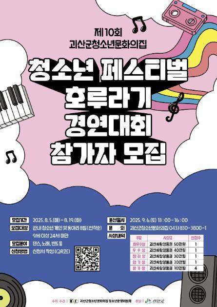 참가 대상은 괴산군에 거주하는 9세 이상 24세 이하 청소년 개인 또는 동아리이며, 댄스, 노래, 밴드 등 장르에 제한 없이 자유롭게 참가 가능하다. 선착순 8팀을 모집해 본선 무대에 오른다.