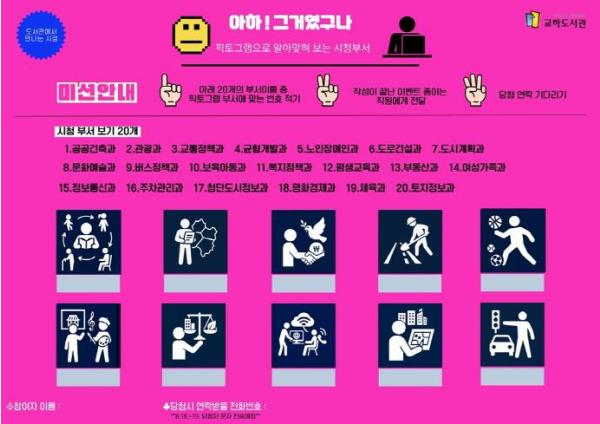이번 행사는 파주시청의 10개 부서를 상징하는 그림기호(픽토그램)와 해당 부서명을 짝짓는 참여형 문제 풀이(퀴즈) 형식으로 진행되며, 교하도서관 내 ‘라운지네모’의 자료실에는 시청 주요 부서에 대한 소개글과 파주시가 새로운 시정 목표로 제시하고 있는 ‘기본사회’와 관련된 도서가 전시되어 도서관 이용자들로 하여금 시정 운영을 뒷받침하는 조직과 기능을 이해하고, 시가 추진하는 핵심 정책의 배경을 보다 쉽게 이해할 수 있는 정보를 보다 쉽게 접할 수 있도록 했다.