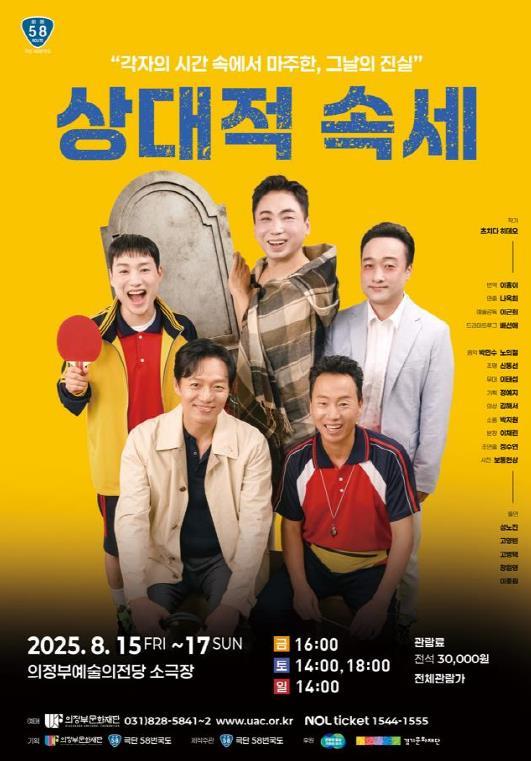 [중앙뉴스라인, 우제헌기자] 의정부문화재단은 오는 8.15.~8.17. 3일간, 극단 58번국도와 함께 창작극 '상대적 속세'를 의정부예술의전당 소극장에서 초연한다.