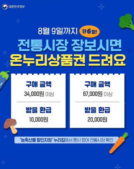 [중앙뉴스라인, 양병남기자] 8월 9일까지 전통시장 장보시면 온누리상품권 드려요.