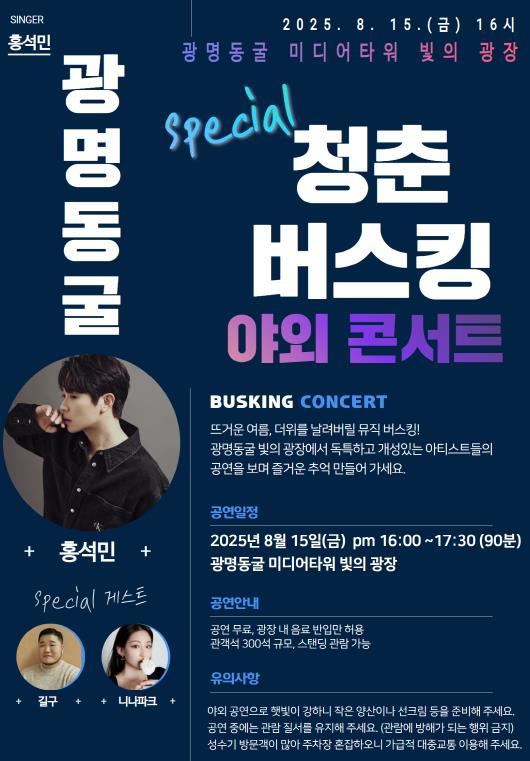 이번 콘서트는 여름 휴가철 광명동굴을 찾은 관광객과 시민들에게 음악으로 특별한 추억을 선사하고 지역 문화예술 저변을 확대하고자 기획됐으며, 감성 짙은 음색의 홍석민, 폭발적인 가창력의 길구, 에너지 넘치는 퍼포먼스로 주목받는 니나파크가 출연하여 무더운 여름 오후를 청춘의 열기로 가득 채울 예정이다.