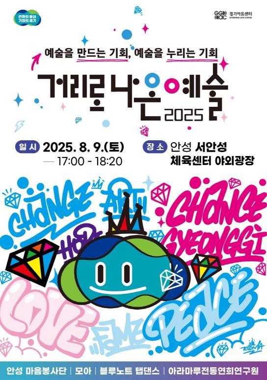 '2025 거리로 나온 예술'은 경기도가 도민들에게 일상 속에서 문화예술을 손쉽게 접할 수 있는 기회를 제공하고, 예술인들에게는 창작 활동을 위한 무대를 지원하기 위해 기획된 사업으로 다채로운 거리공연이 개최될 예정이며, 안성시민에게 특별한 시간을 선사할 것이다.