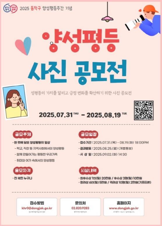 [중앙뉴스라인, 우제헌기자] 동작구가 다가오는 양성평등주간(매년 9월 첫째 주)을 맞아 ‘한 컷에 담은 양성평등의 일상’을 주제로 특별한 사진 공모전을 개최한다고 7일 밝혔다.