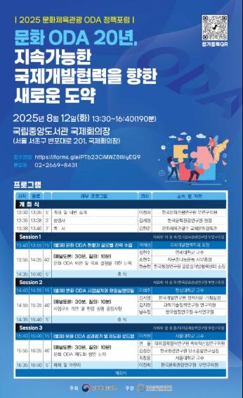 [중앙뉴스라인, 우제헌기자] 문화체육관광부는 한국문화관광연구원과 함께 8월 12일(화) 오후, 국립중앙도서관에서 문화 공적개발원조(ODA) 20주년을 맞이해 ‘지속 가능한 국제개발협력을 향한 새로운 도약’을 주제로 ‘2025 문화·체육·관광 공적개발원조(ODA) 정책 포럼’을 개최한다.