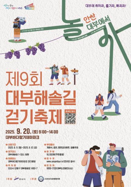한편, 대부바다향기테마파크에서는 9월 19일부터 21일까지 사흘간 ‘대부에 취하자, 즐기자, 빠지자!’라는 슬로건 아래 ‘2025 대부에서 놀자’ 축제가 개최된다. 대부해솔길걷기 축제 외에도 사흘간 열리는 ‘2025 안산 대부포도축제’와 ‘2025 안산 마라톤대회(9월 21일)’가 시민들을 맞이할 계획이다.