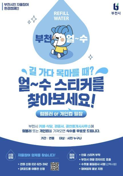 [중앙뉴스라인, 우제헌기자] 부천시는 8월부터 9월까지 시민 자율 참여 환경 캠페인 ‘부천 얼~수(水) [Refill Water]’ 집중 홍보 기간을 운영한다고 8일 밝혔다.