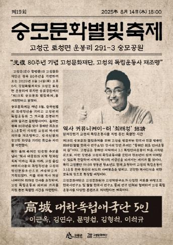 [중앙뉴스라인, 우제헌기자] 평화 경제 거점도시 강원 고성군은 오는 8월 14일 오후 6시, 토성면 운봉리 숭모공원 일원에서 ‘2025 숭모문화 별빛축제–동해안 최초 만세운동의 길’을 개최한다.