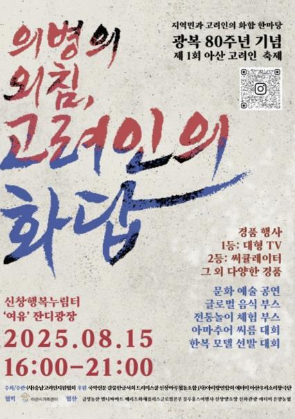 [중앙뉴스라인, 우제헌기자] 광복 80주년을 맞아 고려인과 지역민이 함께하는 ‘제1회 아산 고려인 축제’가 오는 8월 15일 아산시 신창면 커뮤니티센터에서 열린다.