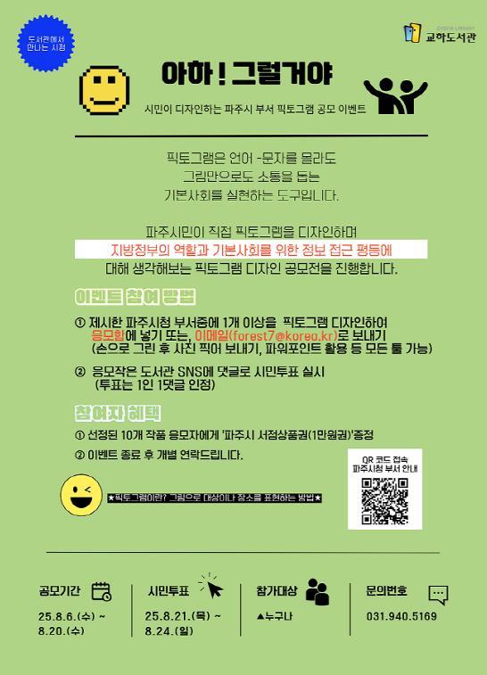 [중앙뉴스라인, 우제헌기자] 파주시 교하도서관 시정홍보 혁신동아리 ‘아하 그래’는 파주시 부서 그림기호(픽토그램) 그리기 행사 ‘아하! 그럴 거야’를 8월 6일부터 20일까지 운영한다.