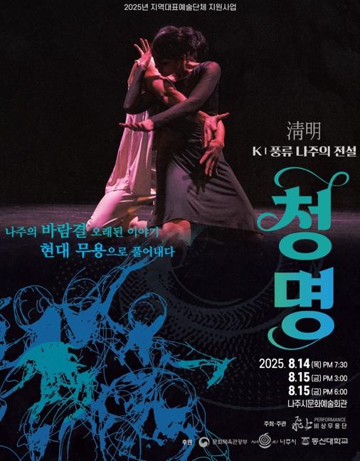 나주시는 12일 문화체육관광부가 주관한 ‘2025년 지역대표 예술단체 육성지원사업’에 선정된 동신대학교 비상무용단이 창작공연 ‘K-풍류 나주의 전설 : 청명(淸明)’을 오는 14~15일 이틀간 나주문화예술회관에서 3회 공연한다고 밝혔다.