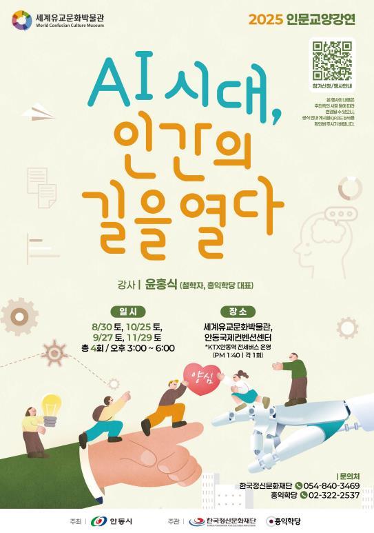 안동시가 주최하고 (재)한국정신문화재단과 홍익학당이 주관하는 이번 강연은 철학자 윤홍식 홍익학당 대표가 ‘AI 시대 인간의 길을 열다’를 주제로 총 4회에 걸쳐 진행한다. 윤 대표는 연세대학교 사학과와 동 대학원 철학과를 졸업하고, 동서양 철학과 종교를 연구하며 ‘양심(良心)’을 핵심 키워드로 대중과 소통해 온 철학자다.