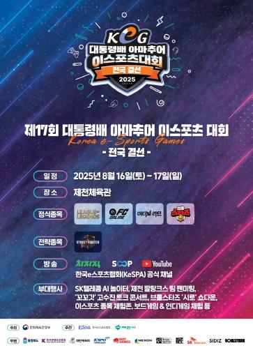 [중앙뉴스라인, 우제헌기자] 문화체육관광부는 8월 16일부터 17일까지 제천체육관에서 ‘제17회 대통령 배 아마추어 이스포츠 대회’ 전국 결선을 개최한다. 이번 대회는 네이버 치지직, 숲(SOOP), 유튜브를 통해 온라인으로 생중계하며, 누구나 현장에서 무료로 관람할 수 있다.