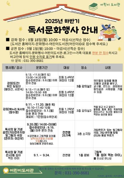 [중앙뉴스라인, 우제헌기자] 군포시 어린이도서관이 다가오는 9월 독서의 달을 맞아 어린이와 가족이 함께 즐길 수 있는 프로그램을 선보일 예정이다. 9월 20일 '기타연주자와 빛그림자 극장'을 시작으로 그림책 원화 전시, 하반기 정기 강좌로는 도전! 위인 탐험대, 책누리 독서회를 준비했다고 알렸다. 이번 프로그램은 독서의 달을 맞이하여 도서관에서 책을 매개로 가족과 함께 소통하고, 정기 강좌로 어린이들이 책을 읽으며 창의력과 사고력을 기를 수 있도록 기획됐다.