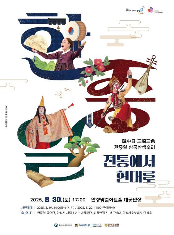 [중앙뉴스라인, 우제헌기자] 안성시는 오는 8월 30일 17시, 안성맞춤아트홀 대공연장에서 '한·중·일 삼국삼색소리 음악회'를 개최한다고 밝혔다.