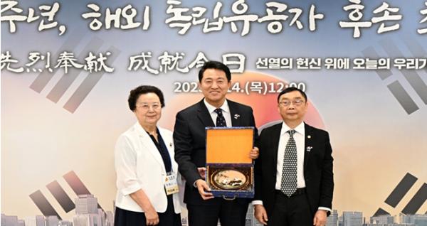 서울시는 광복절 하루 전인 14일 오후 2시, 서울시청(8층 다목적홀)에서 오세훈 서울시장과 광복회 회원, 보훈단체 관계자, 그리고 서울시가 초청한 해외 독립유공자 후손 19명 등 350여 명이 참석한 가운데 ‘광복 80주년 경축식’을 열었다고 밝혔다.