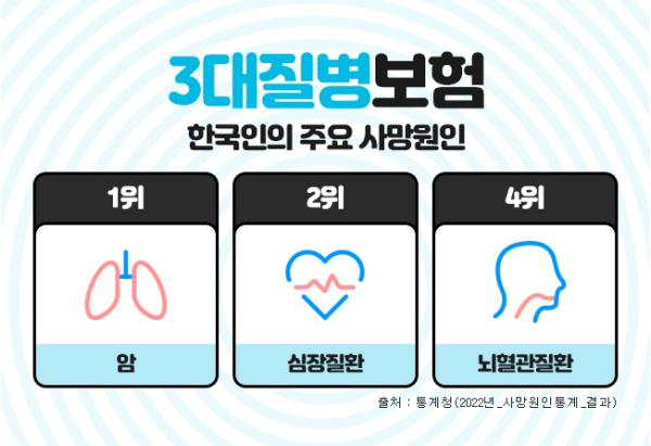 [중앙뉴스라인, 한성영기자] 3대질병으로 일컬어지는 암, 뇌혈관질환, 심혈관질환은 한국인의 주요 사망원인에서 상위를 차지하고 있으며, 이에 대한 진단비를 집중적으로 보장해 주는 보험상품을 3대질병진단비 보험이라 할 수 있다.