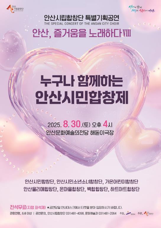 ‘안산, 즐거움을 노래하다’는 시민과 함께 만들어가는 안산시립합창단의 대표적브랜드 공연으로 올해 8회째를 맞았다. 이번 공연에서는 안산시립합창단의 교육사업 ‘안산뮤직아카데미’에서 양성된 안산시민성인합창단과 안산시민소년소녀합창단이 협업하고, 지휘마스터클래스 수료자가 객원지휘에 나선다.