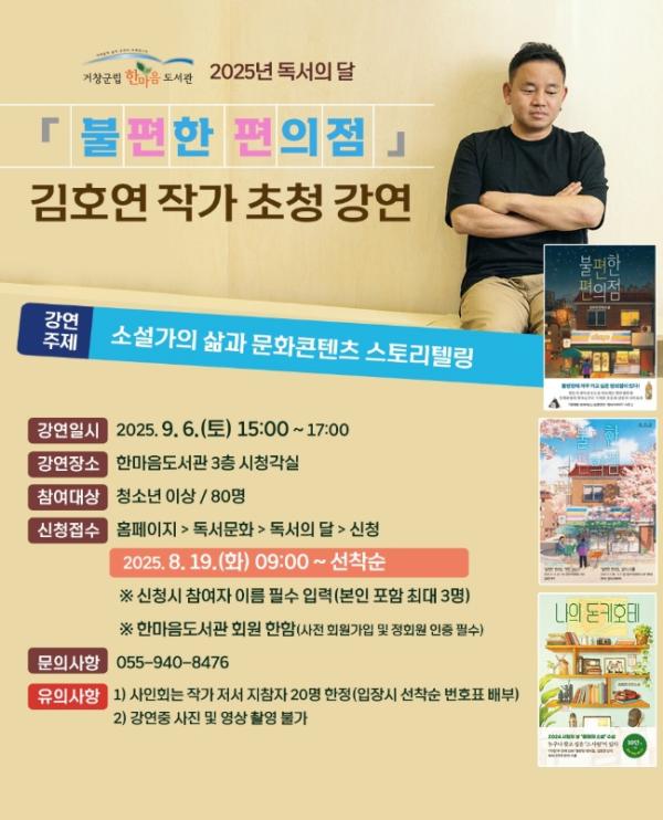 먼저, 9월 6일 오후 3시 ‘불편한 편의점’, ‘나의 돈키호테’의 저자 김호연 작가가 ‘소설가의 삶과 문화콘텐츠 스토리텔링’ 주제로 강연한다. 작가의 창작 에피소드와 스토리텔러로서의 경험을 직접 들을 수 있다.