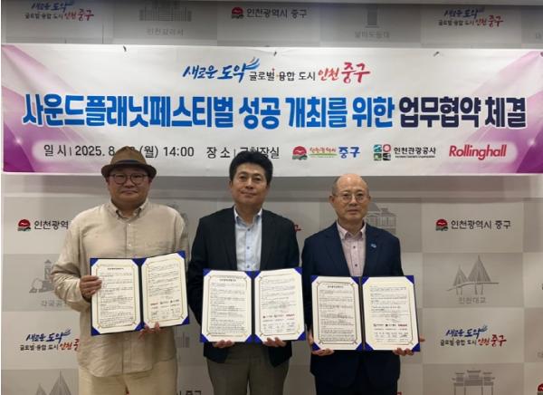 인천관광공사, 인천광역시 중구, ㈜롤링홀(대표 김천성)은 18일‘사운드 플래닛 페스티벌 2025’의 성공적인 인천 개최를 위한 업무협약을 체결했다. 세 기관은 ▲ 3년 간 인천 개최 지원 ▲ 이벤트를 통한 인천시‧중구 관광‧MICE 홍보 ▲ 지역상생 프로그램 추진 등 다각적 협력을 약속했다.