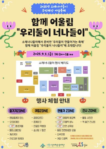 [중앙뉴스라인, 우제헌기자] 시흥시 학교복합시설 소래너나들이센터는 오는 9월 5일 오후 2시 30분부터 오후 6시까지 주민이 직접 기획ㆍ운영에 참여한 주민 제안형 마을축제 ‘함께 어울림 우리 둘이 너나들이’를 개최한다.