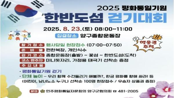 민주평화통일자문회의 양구군 협의회의 주관으로 열리는 이번 걷기대회는 군민이 함께 걸으며 평화와 통일의 염원을 나누고 광복 80주년의 의미를 되새기기 위한 취지로 마련됐다.