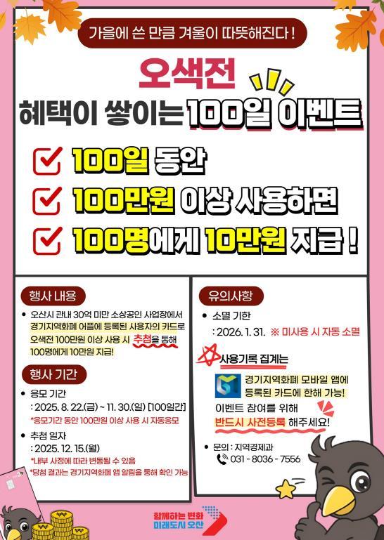 이번 이벤트는 행사 기간인 100일 동안 오색전으로 누적 100만 원 이상 결제한 시민 중 100명을 추첨해 1인당 10만 원을 지급하는 방식이다. 당첨자는 12월 중순 발표될 예정이다. 지급된 금액은 2026년 1월 31일까지 사용할 수 있다. 기간 내 사용하지 않은 잔액은 소멸된다.