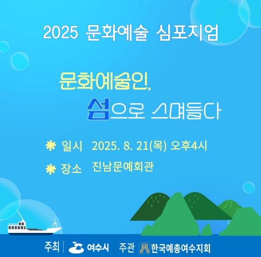 [중앙뉴스라인, 우제헌기자] 여수시는 오는 8월 21일 오후 4시 진남문예회관에서 ‘2025년 문화예술심포지엄(1차) – 문화예술인, 섬으로 스며들다’를 개최한다고 밝혔다.