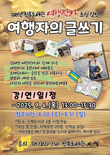 참가자들은 ‘무엇을 쓸지 고민하는 법’부터 ‘사소한 기억을 이야기로 엮는 과정’, ‘생생한 묘사와 감정 전달의 기술’까지 실용적인 팁을 중심으로 교육받게 되며, SNS나 블로그 등을 통해 자신만의 여행기를 전하고자 하는 구민들에게 도움이 될 만한 실전 글쓰기 전략도 함께 다뤄질 예정이다.