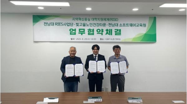 [중앙뉴스라인, 김민수기자] 전남대 RISE사업단(부단장 김장호), 빛고을노인건강타운(본부장 김용덕), 전남대 소프트웨어교육원(부장교수 박혁로)은 8월 20일(수) 오후 G&R허브 3층 회의실에서 지역혁신중심 대학지원체계(RISE) 기반 상호협력 강화를 위한 업무협약(MOU)을 체결했다.