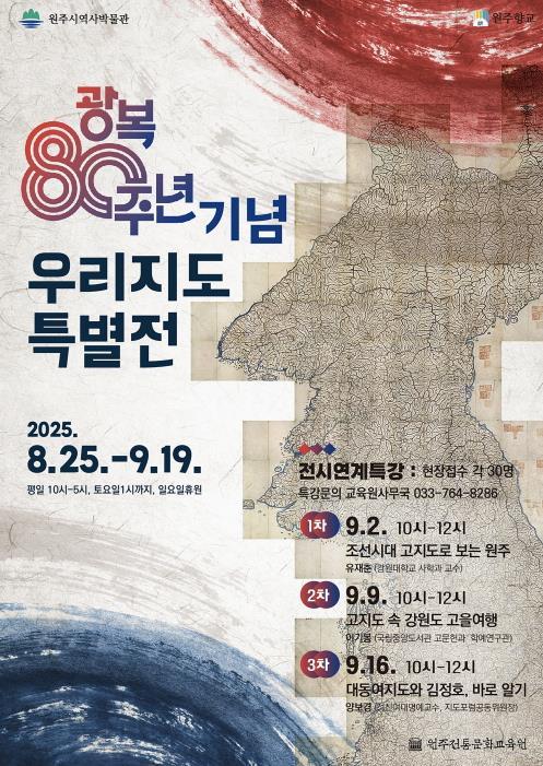 [중앙뉴스라인, 우제헌기자] 원주전통문화교육원은 광복 80주년을 기념해 8월 25일부터 9월 19일까지 ‘우리지도 특별전’을 개최한다.