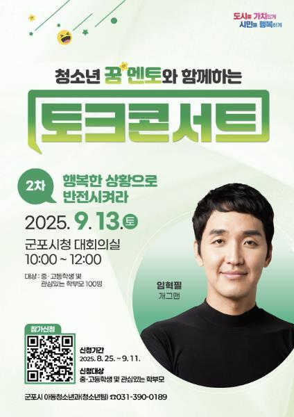 군포시 관계자는 “이번 토크콘서트는 단순한 강연을 넘어, 청소년들이 멘토와의 만남을 통해 자신의 미래를 주도적으로 탐색할 수 있는 계기가 될 것”이라며 “많은 중·고등학생들의 관심과 참여를 바란다”고 전했다.