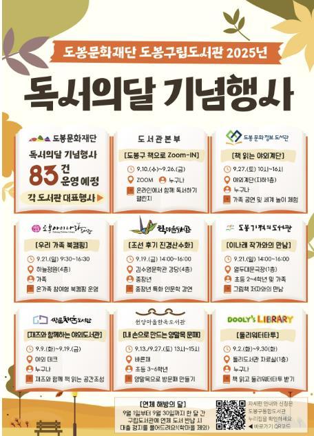 [중앙뉴스라인, 우제헌기자] 서울 도봉구 도봉문화재단 소속 7개 도봉구립도서관이 9월 ‘독서의 달’을 맞아 총 83개의 독서 문화행사를 마련했다.