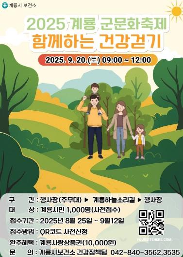 [중앙뉴스라인, 우제헌기자] 계룡시는 오는 9월 20일 개최되는 ‘2025 계룡軍문화축제’와 연계한 ‘건강걷기 행사’ 참가자를 8월 25일부터 9월 12일까지 사전 모집한다고 밝혔다.