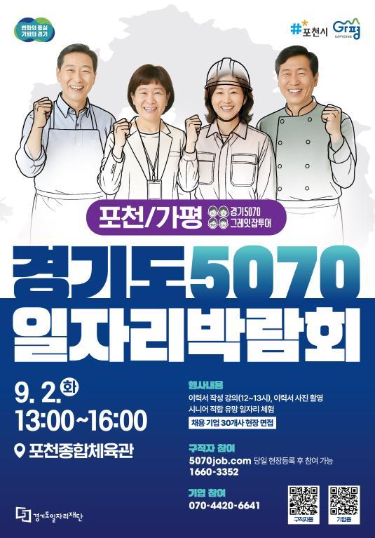 [중앙뉴스라인, 우제헌기자] 경기도와 경기도일자리재단, 가평군, 포천시는 오는 9월 2일 포천종합체육관에서 50~70대 중장년층의 재취업을 지원하는 ‘2025 경기도 5070 일자리박람회 in(인) 포천+가평’을 연다.
