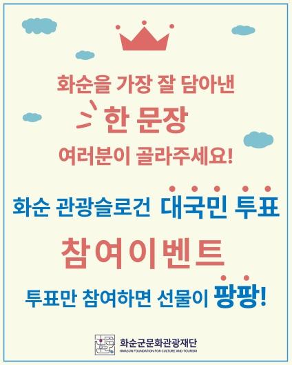투표는 (재)화순군문화관광재단 홈페이지에서 누구나 참여할 수 있으며, 참여자 가운데 추첨을 통해 커피 쿠폰, 치킨 쿠폰을 증정하는 참여이벤트도 함께 진행된다.