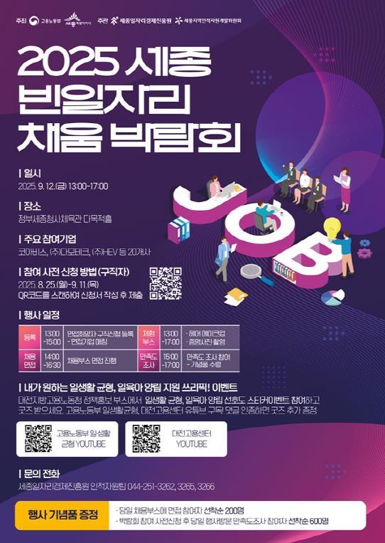 [중앙뉴스라인, 우제헌기자] 세종일자리경제진흥원은 오는 9월 12일 ‘2025년 세종 빈일자리 채움 박람회’를 개최한다. 이번 박람회는 세종시 뿌리산업과 전문과학기술업 기업의 인력난 해소와 지역 구직자의 취업 기회 확대를 위해 마련됐다.