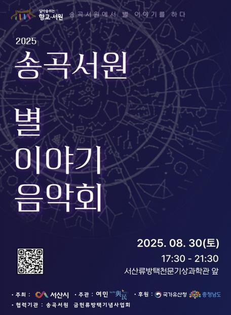 [중앙뉴스라인, 우제헌기자] 서산시는 오는 8월 30일 오후 5시 30분부터 9시 30분까지 인지면에 위치한 송곡서원과 천연기념물 향나무 일원에서 ‘2025 송곡서원 별 이야기 음악회’를 개최한다. 이번 행사는 서산시가 주최하고 문화예술감성단체 여민(與民)이 주관하며, 국가유산청과 충청남도가 후원한다.