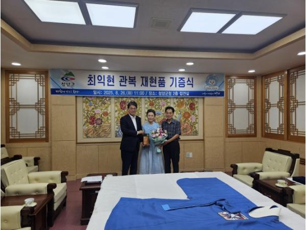 [중앙뉴스라인, 우제헌기자] 청양군은 26일 군청 접견실에서 ‘최익현 관복 재현품 기증식’을 개최했다. 국가민속유산으로 지정된 면암 최익현 선생의 관복을 충청남도 무형유산 서천침선장 전승교육사가 전통 방식으로 재현해 청양군에 기증하는 뜻깊은 자리였다.