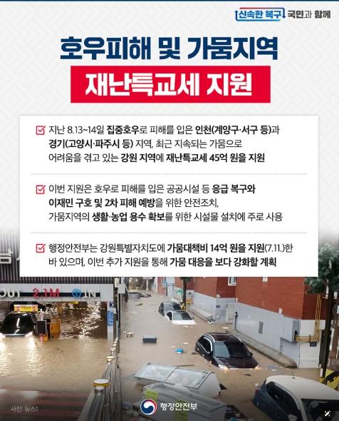 - 지난 8.13~14일 집중호우로 피해를 입은 인천(계양구·서구 등)과 경기(고양시·파주시 등) 지역, 최근 지속되는 가뭄으로 어려움을 겪고 있는 강원 지역에 재난특교세 45억 원을 지원.