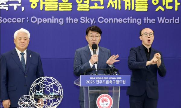 대회 공동 조직위원장을 맡은 우범기 전주시장과 김정태 전주상공회의소 회장은 27일 시청 4층 회의실에서 오는 9월 25일부터 28일까지 4일간 전주월드컵경기장 일원에서 32개국 2700여 명의 선수단이 참가한 가운데 펼쳐지는 ‘2025 전주드론축구월드컵(FIDA World Cup Jeonju 2025)’의 주요 일정과 준비 사항을 발표했다.