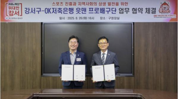 [중앙뉴스라인, 우제헌기자] 부산 강서구와 OK저축은행 읏맨 프로배구단(단장 권철근)은 8월 26일 오후 4시 강서구청 구청장실에서 ‘스포츠 진흥과 지역사회의 상생 발전을 위한 상호 협력 협약’을 체결했다.