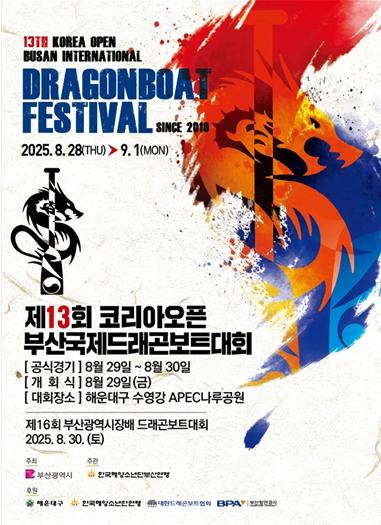 [중앙뉴스라인, 우제헌기자] 부산시는 오늘(28일)부터 9월 1일까지 5일간 수영강 에이펙(APEC) 나루공원 일원에서 '제13회 코리아오픈 부산국제드래곤보트대회 및 제16회 부산광역시장배 드래곤보트대회'를 개최한다고 밝혔다.