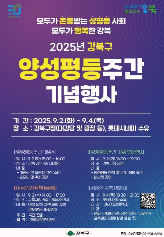 [중앙뉴스라인, 우제헌기자] 서울 강북구는 양성평등주간(9월 1일~7일)을 맞아 오는 9월 2일부터 9월 4일까지 3일간 강북구청 일대에서 ‘2025년 강북구 양성평등주간 기념행사’를 개최한다.