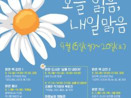 9월 20일에는 '마음 날씨 체험관'행사가 미리내도서관 분수광장에서 진행되고, ▲데이지 도어벨, 데이지키링 만들기 등 체험 프로그램 ▲원주시문인협회 회원의 작품 속 문장전 ▲혁신도시 공공기관 직원들의 한 도시 한 책 읽기 서평 전시 ▲공공기관 홍보 부스도 마련된다.