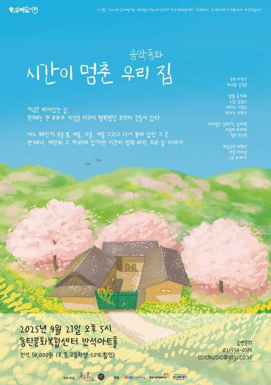 [중앙뉴스라인, 우제헌기자] 화성특례시와 화성시문화관광재단이 추진하는 ‘2025 경기예술지원 : 모든예술31 화성’ 사업에 선정된 국악 크로스오버 단체 ‘타래(TALE)’의 공연 '음악동화 – 시간이 멈춘 우리 집'이 오는 9월 21일 오후 5시, 동탄복합문화센터 반석아트홀에서 열린다.