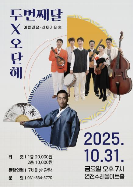 [중앙뉴스라인, 우제헌기자] 연천수레울아트홀은 오는 10월 31일(금) 오후 7시 대공연장에서 월드뮤직 밴드 두번째달과 소리꾼 오단해가 함께하는 ‘산아지타령’ 무대를 선보인다. 전통 민요의 장단에 현대적 사운드를 결합한 크로스오버 콘서트로, 깊어가는 가을밤 연천 관객에게 신명과 서정이 어우러진 이색적인 음악 경험을 선사할 예정이다.