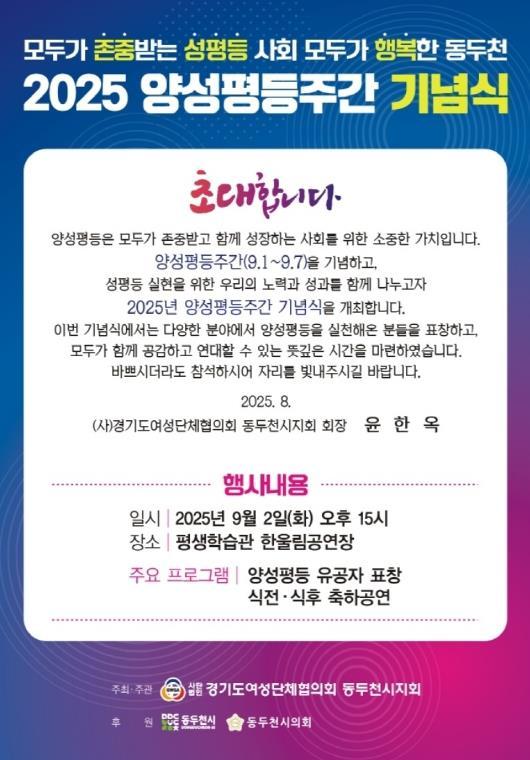 [중앙뉴스라인, 우제헌기자] 동두천시는 양성평등주간(9월 1일~7일)을 맞아 오는 9월 2일 오후 3시 평생학습관 한울림공연장에서 2025년 양성평등주간 기념식을 개최한다고 밝혔다.