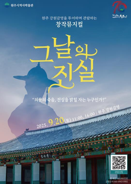 [중앙뉴스라인, 우제헌기자] 원주시역사박물관은 다음 달 20일 강원감영 일원에서 ‘원주 강원감영 미스터리: 그날의 진실’ 2회차 공연을 진행한다.
