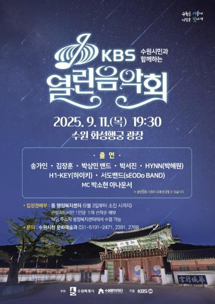 수원시민과 함께하는 KBS 열린음악회, 9월 11일 화성행궁 광장에서 열린다