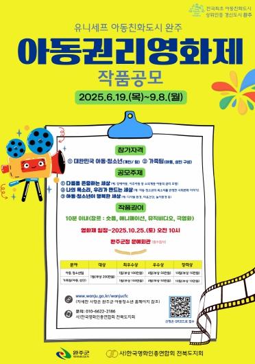 [중앙뉴스라인, 우제헌기자] 유니세프 아동친화도시 완주군이 ‘2025 완주 아동권리영화제’에 상영될 작품을 공모한다.